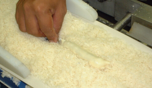 在粘上面浆的虾上均匀扑上面包糠(干面包糠或湿面包糠)。