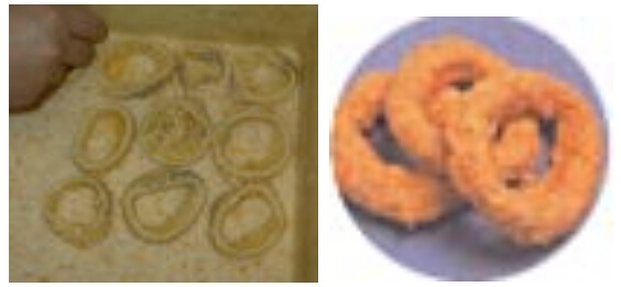 .过面包糠的鱿鱼在油中炸,加工出外脆内软的鱿鱼。